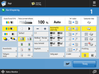 Viser indstillingsstatussen, som f.eks. kopiforholdet, papirformatet og kopiantallet mv. Husk at tjekke indstillingerne her for at kopiere korrekt. For at ændre indstillingerne skal du trykke på knappen under displayafsnittet.