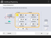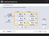 Gå tilbage til skærmen <Korrigér Billedskævhed>, og angiv den målte længde af <i> og <j> (for det lange ark: den målte længde af <h>, <i> og <j>) for forsider og bagsider.Brug følgende to numeriske værdier og "h= 360,0" (for det lange ark: "h = 360,0/450,0/550,0/650,0" for [h], der er nærmest på papirets bagkant), en enhed justeres, så printområdet og papiret bliver parallelt.