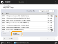 Du kan anvende dropdown-listen Sortér liste til at sortere listen stigende eller faldende efter registreringsdato eller basisvægt. Detaljerede oplysninger om det valgte papir vises, når du trykker på <Detaljer>. Du kan ændre sider ved at trykke på [  ]/[  ] for at vælge og gemme papirtyper, der vises på andre sider. |