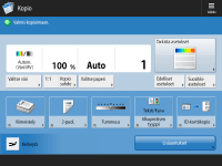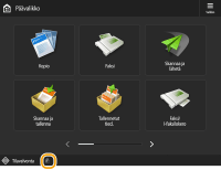 Valitse , joka näytetään <Päävalikko>-näytössä ja perustoimintojen näytössä, niin voit mukauttaa näyttöä, esimerkiksi järjestämällä painikkeet uudelleen tai luomalla pikavalintapainikkeen. Kosketusnäytön muokkaaminen![]() Voit muuttaa näyttöön liittyviä asetuksia, esim. mikä näyttö avautuu heti laitteen käynnistyttyä, ja näytetäänkö jäljellä olevaa paperin ja väriaineen määrää koskeva viesti. <Näyttöasetukset> Voit määrittää mikä ikkuna avautuu, kun tietty aika on kulunut ilman, että laitetta on käytetty. <Toiminta automaattisen nollauksen jälkeen.> |
