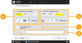 Sähköpostilla lähetettyjä asiakirjoja koskevassa raportissa ilmoitetaan lähetystulokset laitteen ja postipalvelimen välillä, ei laitteen ja vastaanottajan välillä. Voit manuaalisesti tulostaa yhteyksien hallintaraportin käyttöhistorian luettelosta. Raportin määrittäminen tulostettavaksi tiettynä aikana Jos raportti on asetettu tulostettavaksi määrättynä aikana, 100 viimeisintä tulosta tulostetaan, joista viimeisimmät ensin. Jos tulosten määrä on enemmän kuin 100, vanhempia tuloksia ei tulosteta. Kun laite määritetään lähettämään raportti CSV-tiedostona määritettyyn aikaan 2 000 uusinta tulosta viedään CSV-tiedostoon, joka lähetetään määritettyyn aikaan. Jos tulosten määrä määritettynä aikana on yli 2 000, vanhempia tuloksia ei viedä. |