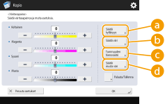 Voit tallentaa enintään neljä asetusta säädön jälkeen. Kun olet säätänyt värin, valitse <Palauta/Tallenna>  valitse painike <C1>–<C4>  valitse <Tallenna>  <Kyllä>  <OK>. |