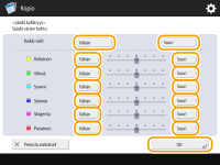 -painikkeella <Kaikki värit> -kohdassa. Voit määrittää kunkin värin erikseen värin vasemmalla ja oikealla puolella olevilla painikkeilla. Kun säätö on valmis, valitse <OK>.