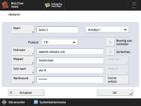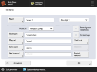 ![]() Vraag uw netwerkbeheerder naar informatie over de bestandsserver. Voor <Hostnaam> kunnen maximaal 128 alfanumerieke tekens via het bedieningspaneel worden ingevoerd. Bovendien kunnen maximaal 255 alfanumerieke tekens worden ingevoerd voor <Mappad>. Houd met het instellen van de server rekening met het maximale aantal tekens. <Hostnaam>Voer de hostnaam van de bestandsserver in. ![]() Wanneer <Windows (SMB)> is geselecteerd Als u <Windows (SMB)> selecteert, worden de knoppen <Zoek host> en <Bladeren> weergegeven. U kunt gemakkelijk een bestandsserver opgeven door het netwerk te zoeken of te bekijken. <Bladeren> is alleen beschikbaar als <1.0> in <Geef SMB Client-versie op> is ingesteld op <Aan>. Wanneer u <Directory> selecteert in de vervolgkeuzelijst op het <Bladeren>-scherm kunt u kiezen uit de domeinnamen van de Active Directory-server die op de machine is geregistreerd. U kunt maximaal vijf Directoryservers opslaan. Wanneer <WebDAV> is geselecteerd Druk na het invoeren van de hostnaam op <Volgende>. <Mappad>Geef de map in de directory op waarnaar de gegevens zijn verzonden. ![]() Als <Windows (SMB)> is geselecteerd voor het protocol, kan <Control. verbind.> alleen controleren tot aan het eerste niveau van het opgegeven mappad. <Gebruikersnaam>Voer de gebruikersnaam van de bestandsserver in. <Wachtwoord>Voer het wachtwoord van de bestandsserver in. ![]() Als u de bestemming waarvoor u <Bevestig voor verzenden> activeert, opgeeft als de doorzendbestemming, verschijnt er geen scherm met de melding dat u het wachtwoord moet invoeren. Het geregistreerde wachtwoord wordt gebruikt en het doorzenden wordt uitgevoerd. <Sorteermap>Als <Sorteermap> is ingeschakeld en u wilt een document scannen en verzenden, kunt u een nieuwe map maken in de in <Mappad> gespecificeerde doelmap en het document in die map opslaan. Vóór het scannen een andere map in de bestemmingsmap maken | ||||||||||||