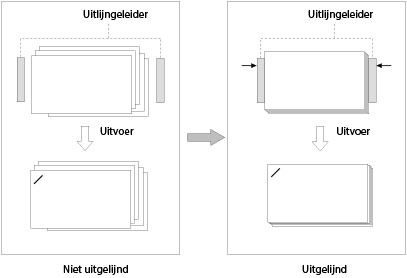 Het gekopieerde of afgedrukte papier kan krimpen als gevolg van de temperatuur, de vochtigheid, of een eigenschap van het papiertype. In dit geval kunt u met deze modus gekopieerde of afgedrukte vellen papier uitlijnen door de positie van de uitlijngeleider in de finisher aan te passen om de uitgelijnde vellen te nieten.