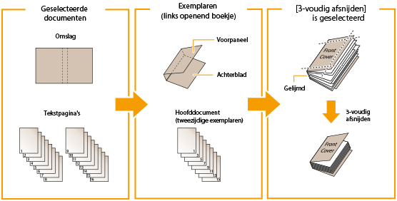 Aangeven in afwerkformaat | 3-voudig afsnijden | 364,0 mm tot tweemaal het formaat van de tekstpagina's + 30,5 mm (364,0 mm tot 487,7 mm) | Breedte van het afwerkformaat + 13,0 mm tot 79,0 mm (257,0 mm tot 330,2 mm) |