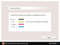 Het waarschuwingsscherm wordt opnieuw weergegeven wanneer toner in een andere kleur bijna op is als <Weergave foutmelding resterende toner> is ingesteld op <Aan>. |