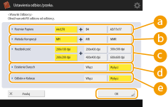 <Rozmiar Papieru>Ustaw format papieru, który może otrzymać odbiorca. Określ to ustawienie po sprawdzeniu, czy format papieru wysyłanych danych odpowiada specyfikacji urządzenia odbiorcy. <A4/LTR>: Wysyła w formacie A4/LTR. <A4/LTR> + <B4>: Wysyła w formacie A4/LTR lub w formacie B4. <A4/LTR> + <A3/11x17>: Wysyła w formacie A4/LTR lub w formacie A3/11" x 17". <A4/LTR> + <B4> + <A3/11x17>: Wysyła w formacie A4/LTR, formacie B4 lub formacie A3/11" x 17". ![]() Jeśli format papieru w zeskanowanych danych jest mniejszy od formatów ustalonych w <Rozmiar Papieru>, dane są wysyłane z pustymi marginesami w najmniejszym formacie ustawionym w <Rozmiar Papieru>. Jeśli format papieru w zeskanowanych danych jest większy od formatów ustalonych w <Rozmiar Papieru>, dane są redukowane i wysyłane w największym formacie ustawionym w <Rozmiar Papieru>. Użytkownik musi określić warunki odbioru zgodnie z warunkami technicznymi urządzenia odbiorcy. Jeśli format papieru w wysyłanych danych jest większy od formatów papieru, których może używać urządzenie odbiorcy, obraz może zostać przycięty lub obcięty. <Metoda Kompresji>Wybierz metodę kompresji. Współczynnik kompresji jest największy dla MMR, mniejszy dla MR i najmniejszy dla MH. Im wyższy współczynnik kompresji, tym krótszy czas wymagany do zakończenia transmisji. <Rozdzielczość>Wybierz większą wartość, aby zwiększyć rozdzielczość i jakość obrazu. Skonfigurowanie wyższej rozdzielczości wiąże się jednak z wydłużeniem czasu transmisji. <Dzielenie Danych>Jeżeli rozmiar wysyłanych danych przekracza limit maksymalny (<Maksymalny Rozm. Wysyłanych Danych>), wybierz, czy chcesz podzielić dane według rozmiarów lub stron. Jeżeli wybierzesz <Włącz>, dane zostaną podzielone na mniejsze pakiety nieprzekraczające limitu maksymalnego, które zostaną wysłane osobno. Urządzenie odbiorcy musi obsługiwać łączenie odebranych danych. W przypadku wyboru ustawienia <Wyłącz> dla opcji <Wyślij przez serwer> ( ) w punkcie 1 konfiguracji I-faksu dane są wysyłane bez dzielenia, nawet jeżeli ich rozmiar przekroczy maksymalną dopuszczalną wartość. <Odbiór w Kolorze>Umożliwia wysyłanie wiadomości kolorowych, jeżeli urządzenie odbiorcy obsługuje taką funkcję. Naciśnij po kolei <Włącz> <Dalej> i ustaw rozmiar papieru i rozdzielczość.![]() Użytkownik musi określić warunki odbioru zgodnie z warunkami technicznymi urządzenia odbiorcy. W przypadku określenia warunków, które nie są obsługiwane przez urządzenie odbiorcy, wtedy może wystąpić błąd transmisji. |