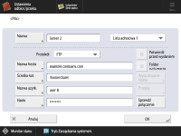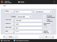 ![]() Informacji o serwerze plików może udzielić administrator sieci. Można wprowadzić do 128 alfanumerycznych znaków dla <Nazwa hosta> z poziomu panelu sterowania. Można wprowadzić do 255 alfanumerycznych znaków dla <Ścieżka kat.>. Określ ustawienia serwera pamiętając o limicie znaków. <Nazwa hosta>Wprowadź nazwę hosta serwera plików. ![]() Gdy wybrany jest <Windows (SMB)> Jeżeli wybierzesz <Windows (SMB)>, przyciski <Wyszukiwanie Hosta> oraz <Przeglądaj> zostaną wyświetlone. Możesz określić serwer plików wyszukując lub przeglądając sieć. Opcja <Przeglądaj> jest dostępna tylko, gdy <1,0> w <Podaj wersję klienta SMB> jest ustawione na <Włącz>. Wybierając <Katalog> z rozwijanej listy na ekranie <Przeglądaj> możesz wybrać spośród nazw domen serwera Active Directory zarejestrowanego na urządzeniu. Użytkownik ma możliwość zarejestrowania maksymalnie pięciu serwerów Katalogu. Jeśli wybrano opcję <WebDAV> Po wprowadzeniu nazwy hosta naciśnij <Dalej>. <Ścieżka kat.>Określ ścieżkę dostępu do katalogu, do którego dane są wysyłane. ![]() Gdy wybrano protokół <Windows (SMB)>, funkcja <Sprawdź połączenie> umożliwia sprawdzenie tylko do pierwszego poziomu określonej ścieżki katalogu. <Nazwa użytkownika>Wprowadź nazwę użytkownika do zalogowania do serwera plików. <Hasło>Wprowadzić hasło logowania do serwera plików. ![]() Jeżeli użytkownik określi odbiorcę, dla którego włączono opcję <Potwierdź przed wysłaniem>, jako odbiorcę przekazywania, ekran informujący o konieczności wprowadzenia hasła nie pojawia się. Zarejestrowane hasło jest wykorzystywane i przekazywanie jest wykonywane. <Folder sortowania>Po włączeniu opcji <Folder sortowania> podczas skanowania i wysyłania dokumentu można utworzyć nowy folder w folderze docelowym określonym w obszarze <Ścieżka kat.> i zapisać zeskanowany dokument w nowym folderze. Tworzenie innego folderu w folderze docelowym przed skanowaniem | ||||||||||||