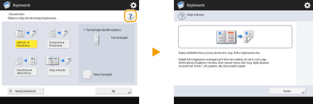 Korzystanie z funkcji pomocyW zależności od wyświetlanej funkcji, jest czasem wyświetlane w prawym, górnym rogu ekranu. Naciśnij na , aby sprawdzić opis i metodę pracy danej funkcji.![]() Naciśnij na <Koniec>, aby powrócić do poprzedniego ekranu. Steruj w ten sam sposób, jak smartfonem (szybkie przesunięcie / zsuniecie/rozsunięcie / przeciągnięcie i upuszczenie)Na niektórych ekranach można przesuwać strony lub przechodzić pomiędzy nimi przeciągając palcem w górę/dół lub w lewo/prawo po ekranie dokładnie tak, jak w przypadku smartfonów. ![]() Można również powiększać/pomniejszać ekran zbliżając do siebie lub oddalając od siebie dwa palce dotykające ekranu. Powiększony obraz można przesuwać za pomocą palca. Personalizowanie wyglądu wyświetlacza i sposobu działania urządzenia ![]() Jeżeli dla opcji <Włącz powiększanie ekranu> wybrano ustawienie <Włącz>, to podczas zbliżania do siebie albo oddalania od siebie dwóch palców na ekranie podglądu cały ekran będzie powiększany/pomniejszany. Jeżeli dla opcji <Włącz powiększanie ekranu> wybrano ustawienie <Wyłącz>, powiększany/pomniejszany będzie jedynie podgląd obrazu.