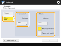 Jeżeli chcesz przesunąć obraz na tylnej stronie podczas kopiowania na obu stronach, niezbędne jest określenie ustawienia <Tylna strona>. Aby przesunąć do tej samej pozycji, co przednia strona, naciśnij na <Tak samo jak przednia strona>. Aby przesuwać symetrycznie, naciśnij na <Przeciwnie do pierwszej str.>. Aby przesunąć do pozycji innej, niż przednia strona, naciśnij na <Ustaw> i wprowadź wartość przesunięcia.