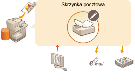 Nośnik pamięci zainstalowany w urządzeniu udostępnia użytkownikowi miejsce zapisywania, określane jako „Skrzynka pocztowa”. Zapisując dokumenty w Skrzynce pocztowej, można edytować pliki, na przykład, łączyć pliki ze sobą lub usuwać poszczególne strony z plików za pomocą urządzenia. Edytowane dokumenty można przekształcić do formatów plików takich jak PDF i TIFF, które są obsługiwane przez komputer, a następnie przesłać je do danego odbiorcy przez e-mail itp. Możliwe jest również zapisywanie dokumentów i zachowywanie ustawień drukowania, takich jak drukowanie dwustronne, umożliwiając drukowanie bez ponownego konfigurowania ustawień.