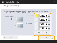 <f>: | Wprowadź zmierzoną na stronie testowej długość znacznika 'f'. W przypadku długiego arkusza: wprowadź wartość obliczoną na podstawie zmierzonej długości znacznika „f” na stronie testowej długiego arkusza. Wartość wejściowa = ((domyślna wartość „f”: 360 mm) / zmierzone położenie „f”: 450, 550, 650 mm)) x zmierzona wartość „f”. |