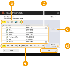 2 | Selecione os destinos que pretende gravar num grupo e carregue em <OK>. ![]() Botão de tipo de destinoSelecione (correio eletrónico), (I-fax) ou (ficheiro) para filtrar os destinos apresentados na lista de endereços ( ). Carregue em <Tudo> para apresentar todos os destinos gravados. DestinoSão apresentados os destinos gravados na lista de endereços que selecionou no passo 6. Nesta lista, selecione os destinos que pretende gravar num grupo. ![]() Quando os destinos são geridos por números de acesso, apenas são apresentados na lista se introduzir o número de acesso (Limitar o Acesso a Destinos Registados no Livro de Endereços) depois de carregar em <N.º acesso>. <Detalhes/Editar>Selecione um destino e carregue em <Detalhes/Editar> caso pretenda verificar as programações do destino. Carregue em <OK> para regressar ao ecrã anterior. <Procurar por nome>Introduza o nome do destino. Carregue novamente em <Procurar por nome> para regressar ao ecrã anterior. Botão de primeira letraSelecione o botão alfanumérico para o primeiro caráter do nome de destino. Carregue em <Tudo> para apresentar todos os destinos gravados. |