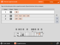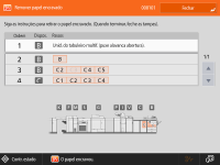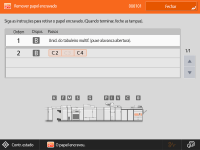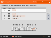 As tabelas seguintes mostram ecrãs e localizações habituais de encravamentos de papel (imagem) ao utilizar folhas longas de 1.300 mm, bem como referências a procedimentos de acordo com os mesmos. As localização dos encravamentos de papel podem variar ligeiramente devido a situações como o comprimento do papel e o momento do encravamento de papel. |