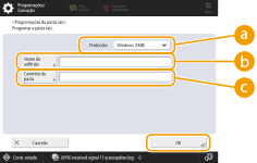 2 | Especifique a pasta raiz e carregue em <OK>. ![]() <Protocolo>Selecione o protocolo a utilizar ao aceder a Pastas pessoais. <Nome do anfitrião>Introduza o nome do anfitrião ou o endereço IP do computador onde pretende criar a pasta raiz. <Caminho da pasta>Introduza o caminho para a pasta raiz. Por exemplo, introduza "utilizadores\público\partilha" para uma pasta raiz criada dentro de uma subpasta chamada "partilha" na pasta "Público" da unidade C: (caminho: "C:\utilizadores\público\partilha"). ![]() Pode não ser possível especificar o caminho se existirem muitos níveis de pastas. |