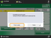 Para verificar o número total de destinos especificadosO número total de destinos especificados é apresentado na parte superior direita do ecrã. Isto permite-lhe confirmar se o número de destinos está correto antes do envio. Para enviar com as informações do remetentePara verificar os estados dos documentos enviadosNo ecrã <Contr. estado>, pode verificar os estados dos documentos enviados. Este ecrã permite enviar I-faxes novamente ou cancelar o envio após a verificação dos estados. Se o item <Mostrar notificação quando trabalho for aceite> for programado para <Ligado>, é possível aceder ao ecrã <Contr. estado> a partir do ecrã seguinte que é mostrado após a receção de um trabalho de envio. <Mostrar notificação quando trabalho for aceite>Para imprimir o relatório dos resultados de envioNo ecrã das funções básicas de leitura, carregar em <Opções>  <Relatório TR.> permite programar a impressão automática do relatório com os resultados de envio. Para programar isto para cada trabalho em <Opções>, tem de selecionar <Só para erros> ou <Desligado> em <Relatório TR.> e, em seguida, programar <Permitir a partir de Opções> como <Ligado>. Para enviar ficheiros em segurançaQuando são alimentadas várias folhasA leitura é interrompida e a mensagem é apresentada no ecrã. Siga as instruções para retirar o papel encravado. Quando tiver retirado o papel encravado, o ecrã para retomar o trabalho é apresentado. Se a máquina detetar incorretamente a alimentação de várias folhas, carregue em <Não detetar alim. várias folhas> para retomar a leitura. Para programar a máquina antecipadamente para não o notificar da alimentação de várias folhas, efetue uma das operações seguintes. Sempre que enviar, carregue em <Opções> no ecrã das funções básicas de fax  selecione <Detet. ali. vár. folh. aliment.> para desativar a programação. Quando as fotografias na imagem enviada são muito escuras ou não é possível remover cores claras no fundo de originais a coresÉ possível melhorar a qualidade da imagem enviada se as condições/programações seguintes forem satisfeitas. Tipo de trabalho: Ler e enviar (I-fax) <Selecionar cor>: <Preto e branco> <Tipo de original>: <Texto> <Densidade>  <Densidade do fundo>: <Auto> <Resolução>: 200 dpi x 400 dpi, 300 dpi x 300 dpi, 400 dpi x 400 dpi ou 600 dpi x 600 dpi |