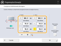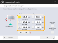 Volte ao ecrã <Corrigir erro alinh. imagem> e introduza o comprimento medido de <i> e <j> (para a folha longa: o comprimento medido de <h>, <i> e <j>) para frente e verso.Utilizando os dois valores numéricos seguintes e "h = 360,0"(para a folha longa: "h = 360,0/450,0/550,0/650,0" para [h] mais próximo da extremidade inferior do papel), um dispositivo procede ao ajuste para que a área de impressão e o papel possam ficar paralelos.