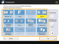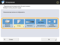 Количество элементов на экране основных функций и порядок их отображения отличается в зависимости от функции. Кнопка быстрого вызова не отображается, если в качестве кнопки быстрого вызова установлено <Не назначено>. Ниже указаны ограничения для числа клавиш быстрого вызова для <Параметры>, которые можно зарегистрировать. Копирование (базовые): 5 Копирование (экспресс): 6 Сканировать и отправить: 2 Если вы заменили экран основных функций копирования на экран экспресс-копирования (Быстрое изменение параметров (экран экспресс-копирования)), выберите кнопку на шаге 3 и нажмите кнопку <Зарегистрировать>. |