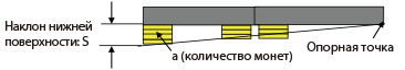 Наклон пола (Этот метод используется, если пол имеет небольшой уклон.) | Расположите две плиты настила рядом друг с другом и положите их на то место, где планируется установить аппарат. Также как и в способе «Ровность пола», одну плиту положите горизонтально. Затем вставьте прокладки (круглые опоры) под другую плиту пола, чтобы установить плиту горизонтально с той высотой, которую вы установили сначала. В этом случае вставьте прокладки в произвольном положении с краю плиты. Измерьте наклон пола с помощью толщины прокладок, расположенных дальше всего от опорной точки (точка, определенная как контрольная отметка высоты) (см. рисунок ниже).