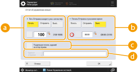 Невозможно настроить параметры печати отчета об управлении связью, если для параметра <Показать журнал заданий> в списке параметров <Параметры управления> установлено значение <Выкл.>. Кроме того, если изменить значение параметра <Показать журнал заданий> в списке параметров <Параметры управления> с <Выкл.> на <Вкл.>, значение параметров печати отчета об управлении связью <Печ./Отправка каждого указ. кол-ва пер.> и <Печать/Отправка в указанное время> автоматически меняется на <Выкл.>. <Показать журнал заданий> |