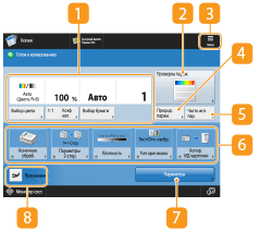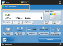 В этой области отображается настроенное значение, например коэффициент масштабирования, формат бумаги и количество копий. Подтвердите параметры, чтобы копирование было выполнено должным образом. Для изменения значений нажмите кнопку, расположенную под этой областью.