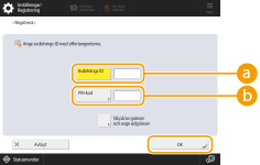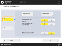 Kontrollera att avdelnings-ID har ställts in för användare som är registrerade i maskinen. Registrera användarinformation på den lokala enheten Hantering av avdelnings-ID gäller bara för användare som har registrerats på den lokala enheten. Om du loggar in som en användare med administratörsbehörighet tilldelas automatiskt systemansvarig-ID och PIN-kod och de hanteras som avdelnings-ID. |