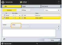 Om du trycker på (Stopp) på kontrollpanelen när det finns väntande kopieringsjobb, pausas alla kopieringsjobb och meddelandet <<Stopp>Välj det kopieringsjobb du vill avbryta.> visas tillsammans med listan över kopieringsjobb. Du kan välja ett kopieringsjobb i listan och avbryta det genom att trycka på <Avbryt>. Om du vill återuppta kopieringen, tryck på <Forts. kopiering>. |