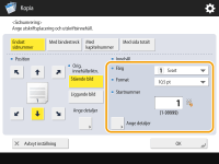 Siffror och symboler skrivs inte ut på omslag (Lägga till ett främre och ett bakre omslag) eller infogade ark (Infoga ark och kapitelsidor (Infogade ark)). Kopiesatsnummer skrivs ut på alla kopierade sidor. Kopiesatsnummer kan skrivas ut tillsammans med datum eller text. <Inställ. för alternativ för kopiesatsnumrering> Texten för <Sidnumrering> och <Vattenstämpel> kan också väljas från texten som har registrerats i <Registrera tecken för sidnumrering/vattenstämpel>. Om du anger två av <Sidnumrering>, <Vattenstämpel>, <Utskriftsdatum>, eller <Kopiesatsnumrering> om ska skrivas ut på samma position, visas en fråga om du vill skriva ut med dessa inställningar när du trycker på (Start).Om du väljer <Med kapitelnummer> i kombination med <Infoga ark>, räknas kapitelnumren på följande sätt: Efter infogning av varje kapitelsida Efter varje arkinförande förts in Om du ställer in <Inställ. för alternativ för kopiesatsnumrering> på <På>, ändras de inställningar du kan ange på följande sätt. <Inställ. för alternativ för kopiesatsnumrering> Du kan inte längre välja <Hela ytan> och <Nummer på 5 ställen> som utskriftspositioner i läget Kopiesatsnumrering. Sifferstorlekarna i läget Kopiesatsnumrering blir <10,5 pt>, <12,0 pt> och <14,0 pt>. |