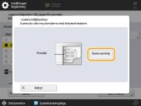 Innan du gör justeringar bör du rengöra scanningsområdet på originalglaset och i mataren. Rengöra dokumentmataren Använd följande villkor för att skriva ut provsidan. Exakt justering kanske inte kan erhållas om provsidan inte skrivs ut korrekt. Pappersformat: 100 mm x 148 mm till 297 mm x 1 000 mm Yta: Obestruket, Återvunnet, Bomull Typ: Normal, Brevpapper Basvikt: 52 till 220 g/m2 Om du skriver ut provsidan på papper i ett annat format än det angivna pappersformatet kanske bildens placering inte justeras korrekt. Om en kant på testsidan är felaktigt skuren eller vikt, eller om bilden inte har skrivits ut korrekt på testsidan kan meddelandet <Placera provsidan korrekt på originalglaset.> visas under scanningen. Justeringen utförs inte på rätt sätt med vissa papperstyper, t.ex. strukturerat papper med grov yta eller färgat papper. Om justeringen inte blir korrekt när du har valt <Använd scanner> väljer du istället <Använd inte scanner>. I följande fall kan provsidan inte skannas korrekt och justeringen kan inte utföras: Provsidan är sned när den skannas Pappersformatet är som EXEC eller G-LGL, som kan vara snett vid skanning eftersom pappersledaren inte kan fixeras. |