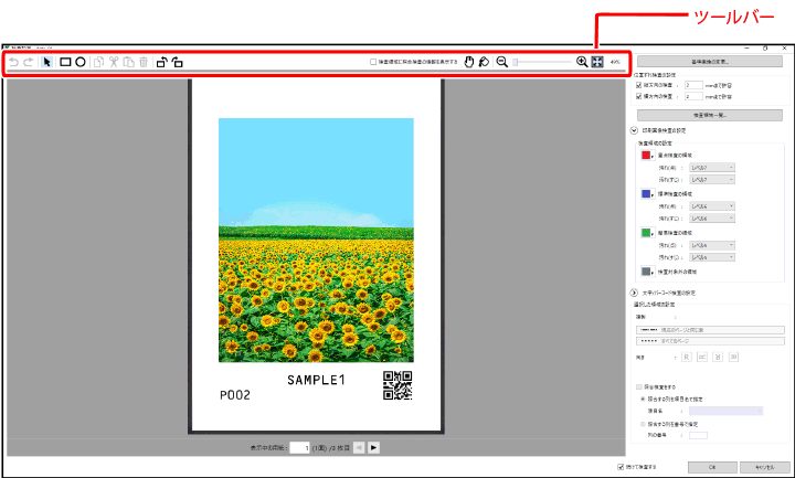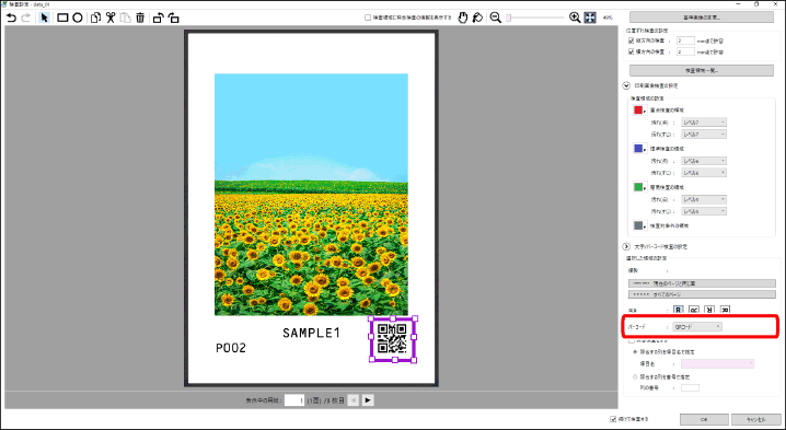 [文字検査の領域] と [バーコード検査の領域] で設定できる領域数は、検査対象の印刷物の用紙サイズによって異なります。 搬送方向の長さが355.6 mm未満の用紙(A5R/B5/B5R/A4/A4R)の場合:表裏それぞれ合計で最大15箇所