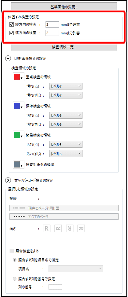 位置ずれ検査の対象にチェックマークを付けて、許容値を入力する