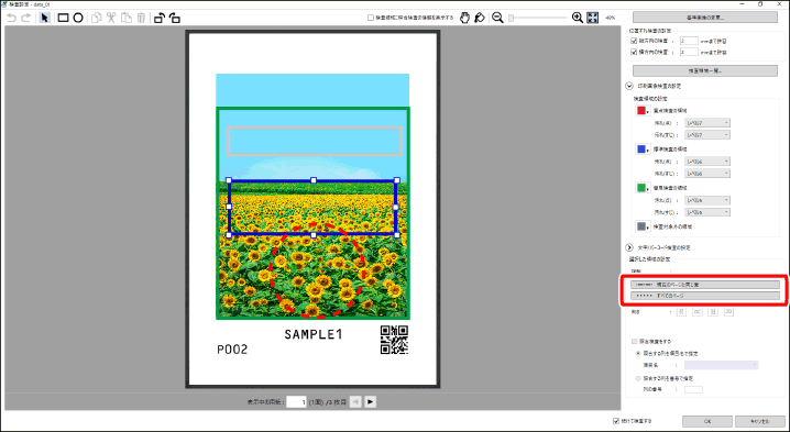 | [すべてのページ]が適用された検査領域。 この指定をした後に領域を編集すると、他のページのすべての面に編集結果が反映されます。 |