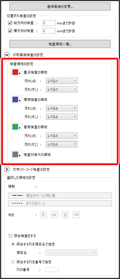 画像の検査領域を選択し、それぞれの領域に対して[印刷画像検査の設定]の[検査領域の設定]で[汚れ(点)]と[汚れ(すじ)]の検査レベルを設定する