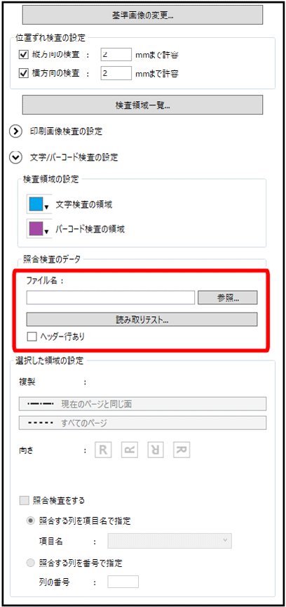 1. [文字/バーコード検査の設定]の[照合検査のデータ]で[参照]ボタンをクリックし、正しい文字列が入力されたCSVファイルを指定する