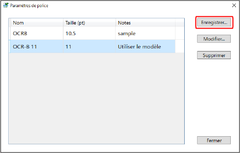 Affiche une liste des polices déjà enregistrées. Afin de faciliter l'identification ultérieure des détails qui ont été enregistrés, il est recommandé de saisir les informations d'identification dans le champ [Nom] et [Notes]. Si les caractères du tableau ont été enregistrés automatiquement, [Utiliser le modèle] s'affiche dans [Notes]. Pour supprimer les détails enregistrés, sélectionnez la police que vous souhaitez supprimer sur l'écran [Paramètres de police] et cliquez sur [Supprimer]. |