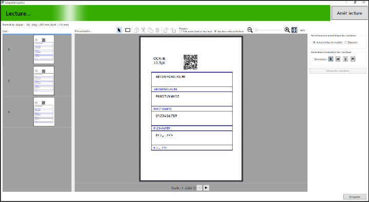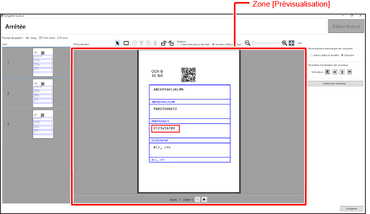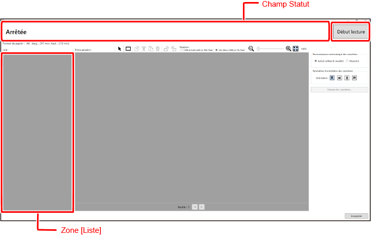 Vous pouvez modifier la rotation et l'agrandissement des pages affichées à l'écran. Pour plus de détails, veuillez vous référer à ce qui suit. Pour supprimer la zone de texte configurée, sélectionnez la zone que vous souhaitez supprimer à l'aide de  ([Outil de sélection de la zone des caractères]) et cliquez sur  [Supprimer]. |