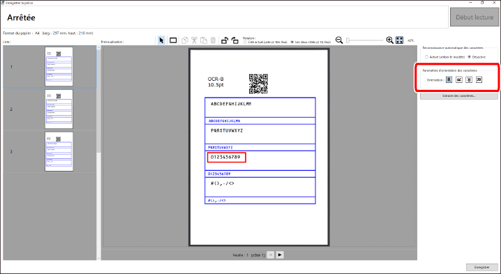 [Reconnaissance automatique des caractères] | [Activé (utiliser le modèle)] Lit automatiquement tous les caractères du tableau d'enregistrement des polices. Passez à l'étape 12. [Désactivé] Lit les caractères spécifiés dans le tableau d'enregistrement des polices. Spécifiez individuellement les caractères à lire. |