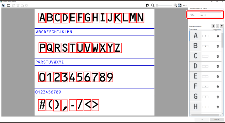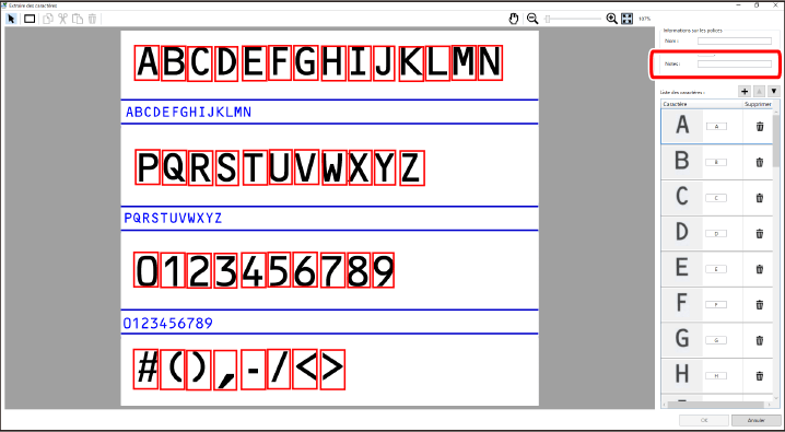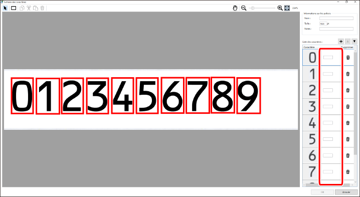 Si [Désactivé] est sélectionné dans [Reconnaissance automatique des caractères], vérifiez les cadres de découpe des caractères à enregistrer et entrez les caractères dans [Liste des caractères]. Vous pouvez ajuster les cadres de découpe en utilisant