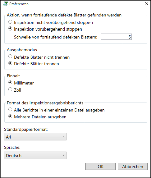 [Inspektion nicht vorübergehend stoppen] | Setzt die Inspektion fort, ohne zu stoppen, auch wenn es mehrere fortlaufende defekte Blätter gibt. |