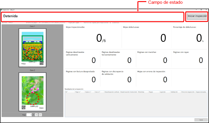El número de hojas inspeccionadas y los resultados de inspección se mostrarán en la pantalla [Inspección]. Proceda con el paso 7.