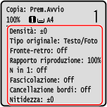 Oltre alle impostazioni di base per la copia, la macchina dispone anche di altre impostazioni per effettuare la copia fronte-retro, la regolazione della qualità dell’immagine e altre funzionalità che variano in base all’originale e alla finalità di utilizzo. Servirsi della schermata dedicata alla copia per configurare queste impostazioni.
