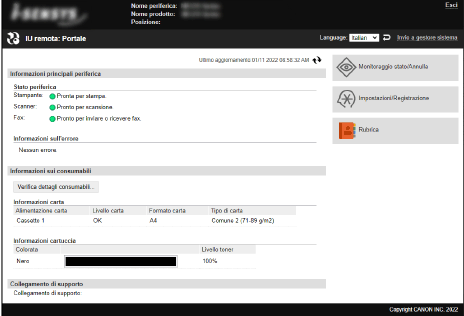 Quando si accede alla IU remota, viene visualizzata la pagina portale (prima pagina della IU remota). Da qui è possibile verificare lo stato operativo della macchina, visualizzare varie informazioni e modificare le impostazioni mediante l’utilizzo dei pulsanti.