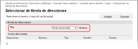 En [Tipo], seleccione [Teclas abreviadas] o [Marcación codificada], y haga clic en [Mostrar] para cambiar la visualización de la Libreta de direcciones.