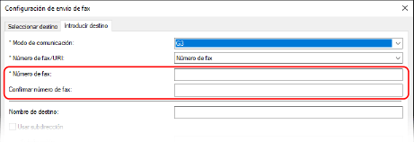 En la pestaña [Introducir destino], introduzca un número de fax. Si se puede introducir [Confirmar número de fax], introduzca el mismo número de fax.