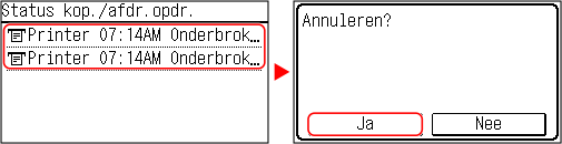 Als het scherm met de taaklijst verschijnt, selecteer dan de taak die u wilt annuleren, en druk op [Ja].