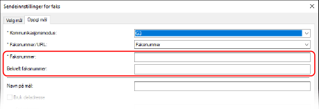 Skriv inn et faksnummer på fanen [Oppgi mål]. Når [Bekreft faksnummer] kan angis, skriver du inn det samme faksnummeret.