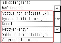 I tillegg til MAC-adressen og tilkoblingsinformasjon for trådløst LAN når maskinen er koblet til et trådløst LAN, kan du også vise sikkerhetsinnstillingene.