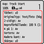Förutom grundläggande kopieringsinställningar har enheten även inställningar för dubbelsidig kopiering, justering av bildkvalitet och andra inställningar beroende på original och syfte. Dessa inställningar anger du på kopieringsskärmen.
