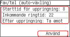 Ange tiden för ringsignalen och åtgärder när ett fax tas emot. Tryck sedan på [Använd].